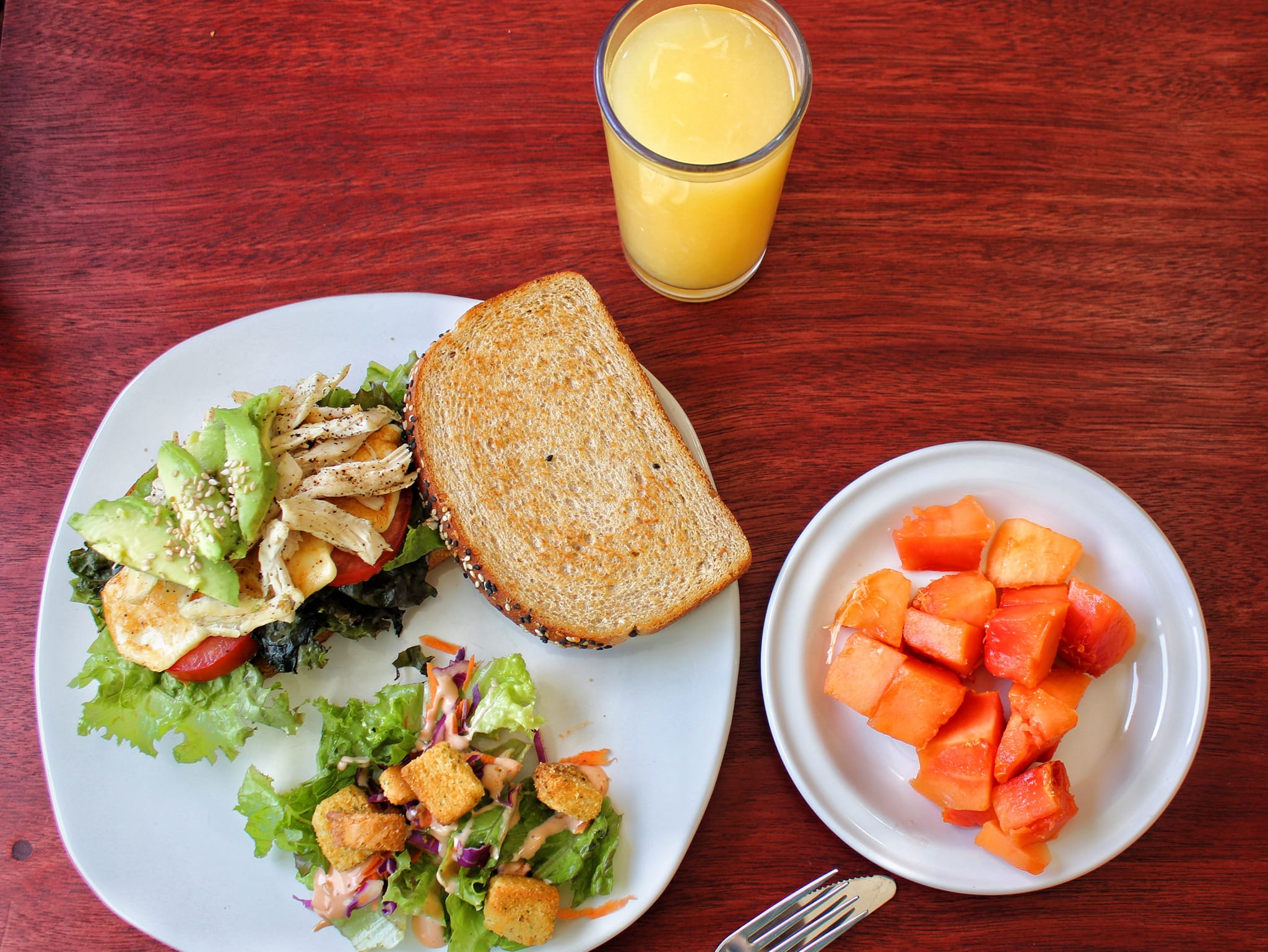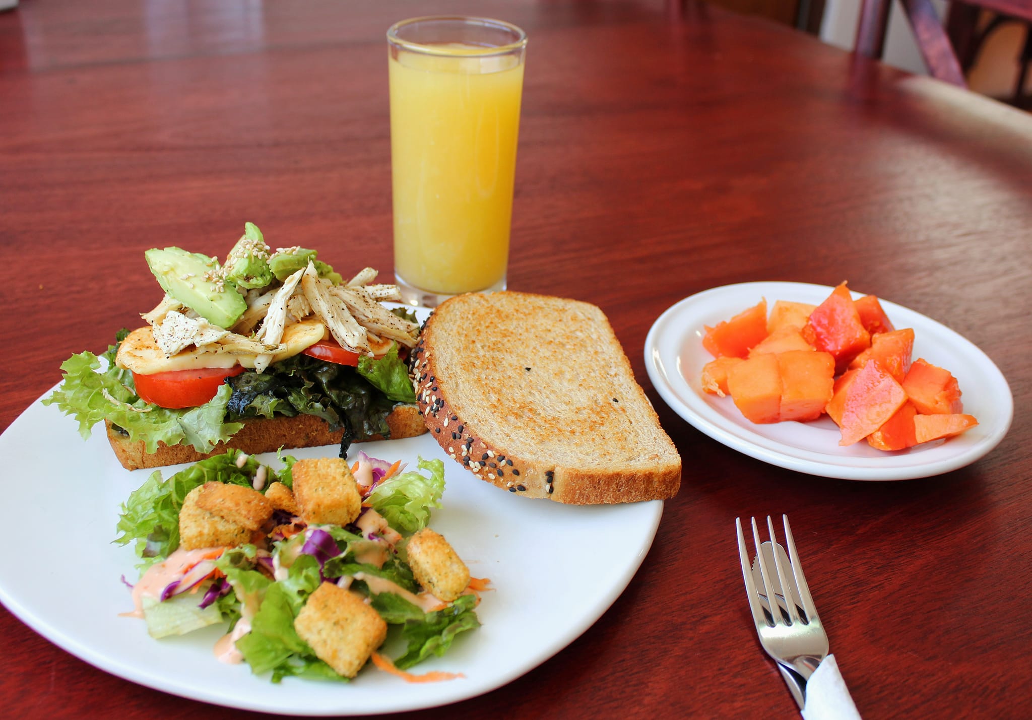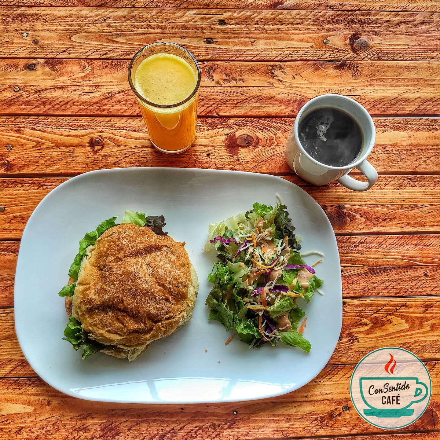 Emparedado de 7 granos, relleno de pollo al vapor, lechuga, jitomate, cebolla morada, queso panela y aguacate.