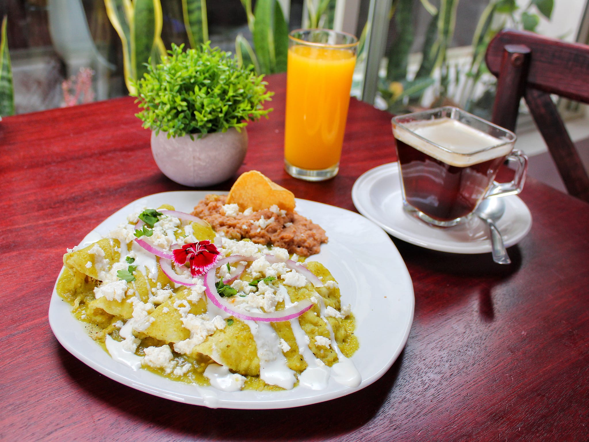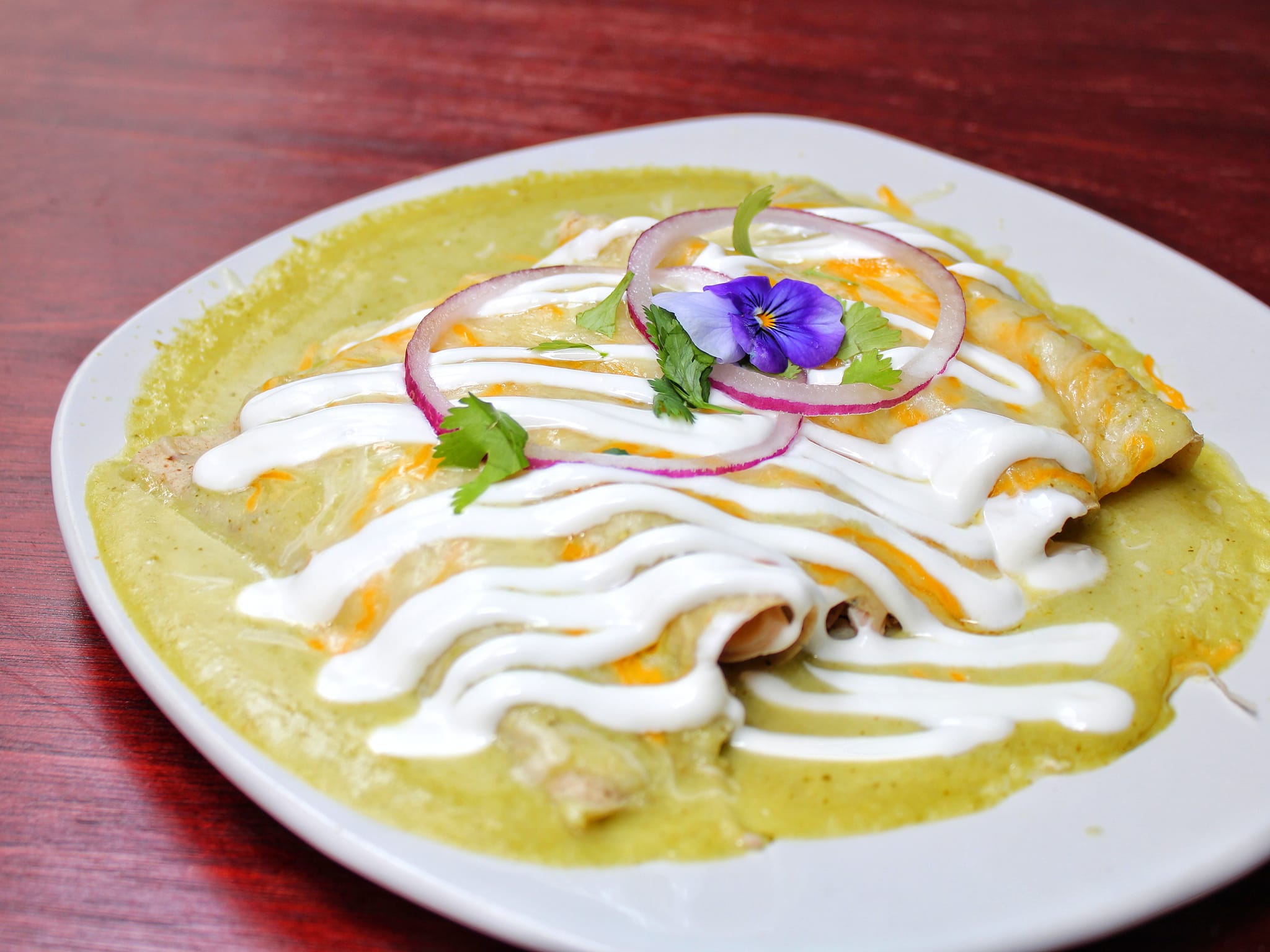 Deliciosas enchiladas de pollo, bañadas en salsa verde o roja, acompañadas de crema, queso fresco y frijoles. (4 piezas)