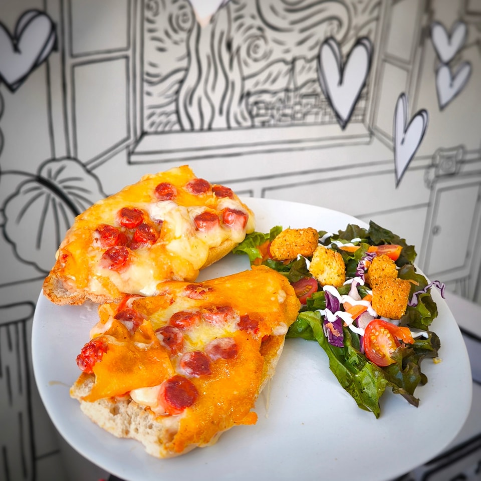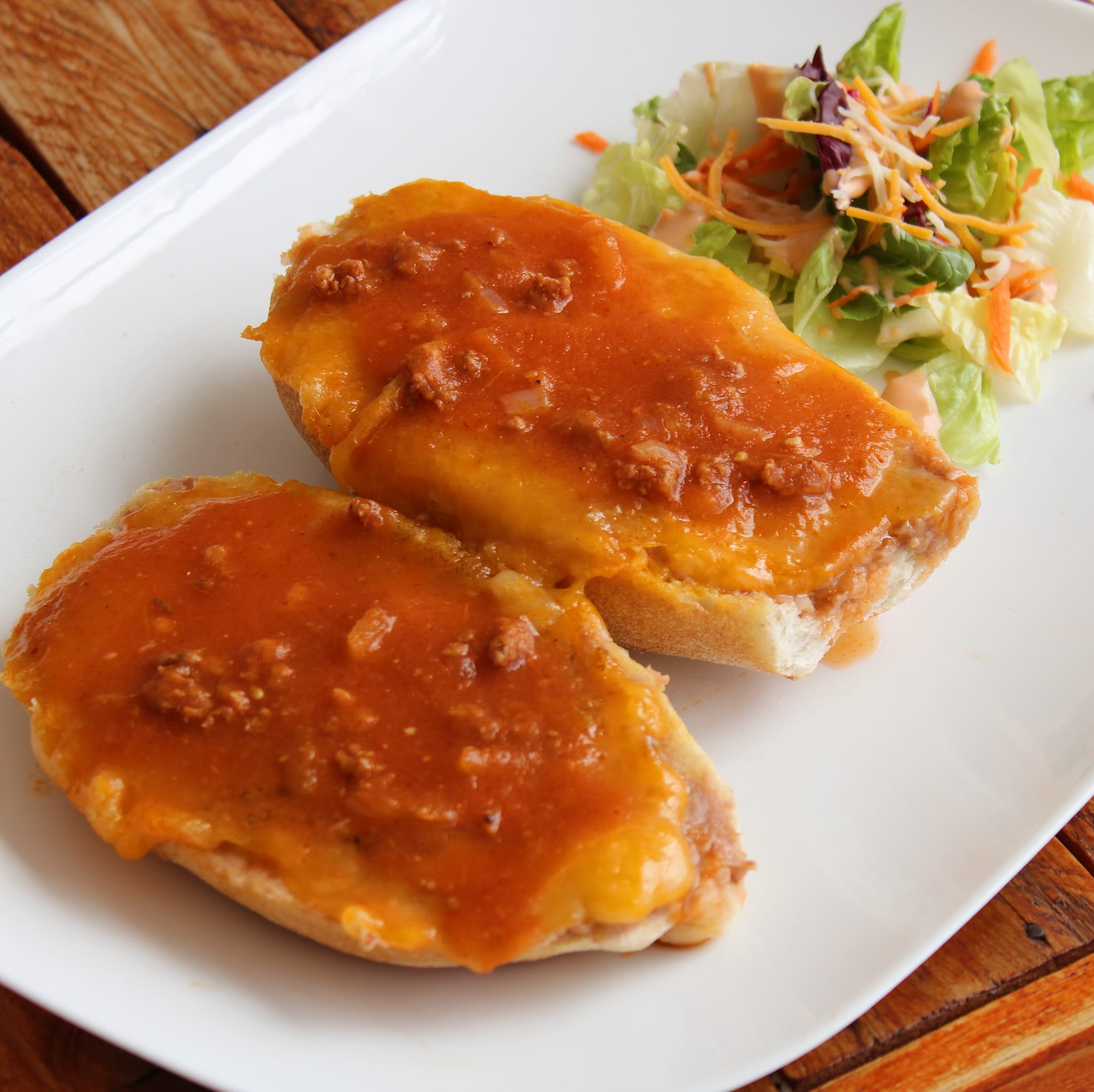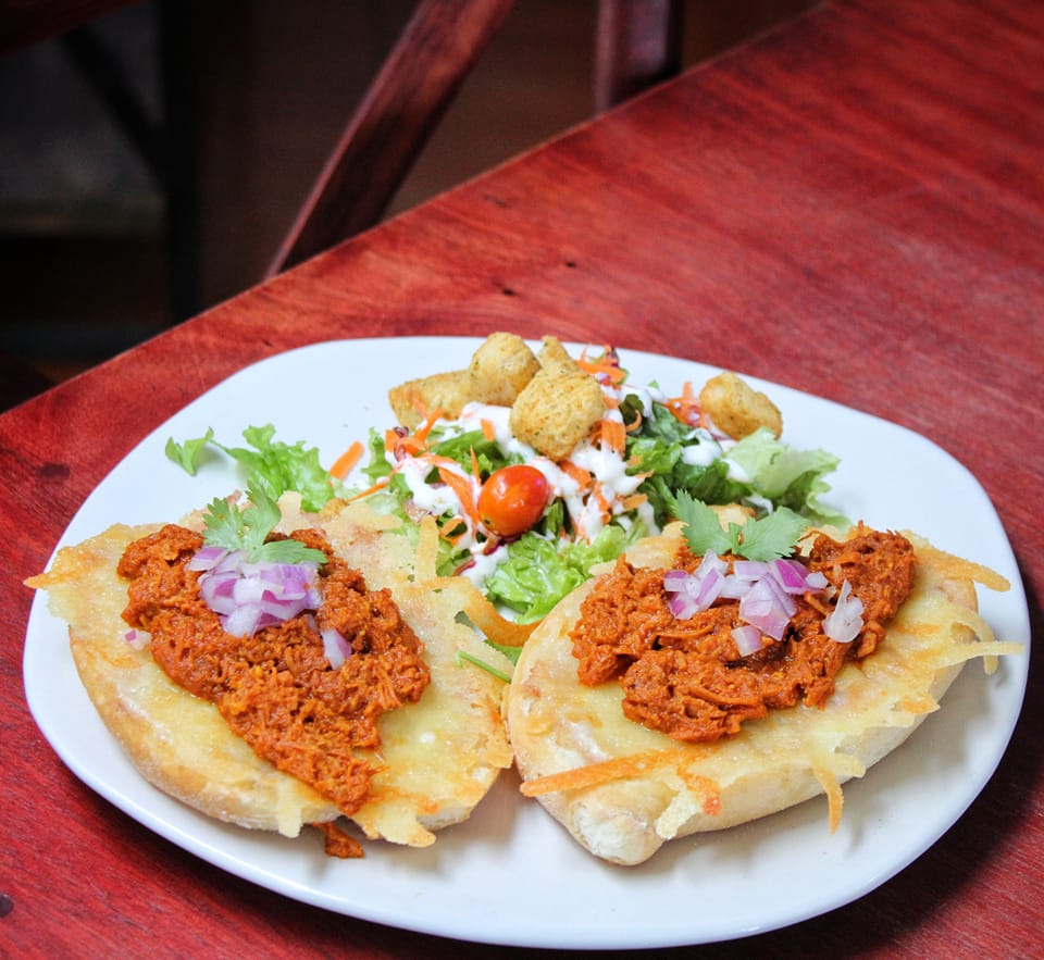 Deliciosos molletes elaborados con frijoles, cochinita pibil, queso manchego y cebolla morada curtida con chile habanero.