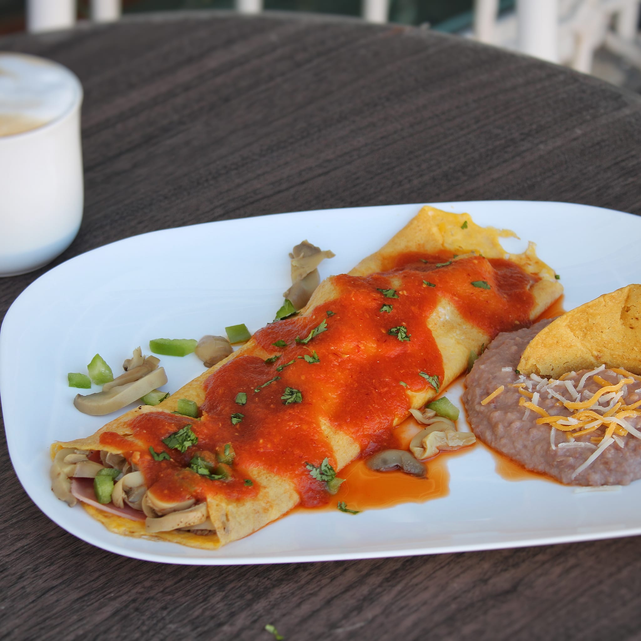 Relleno de queso panela, espinacas, jamón de pavo, champiñones y aguacate.