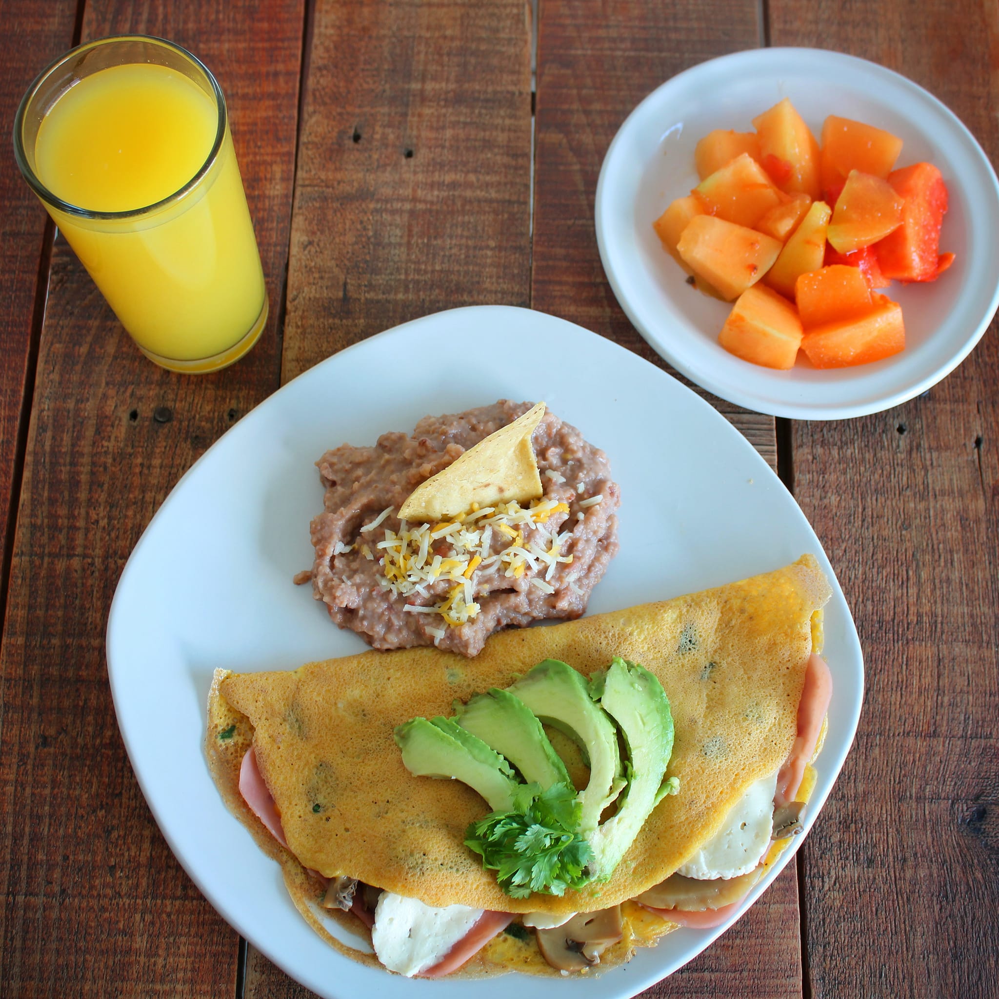 Todos los desayunos incluyen café americano. HAZ TU DESAYUNO COMBO POR $35, Incluye jugo de naranja (355 ml) y fruta. Cambia tu café americano por:
