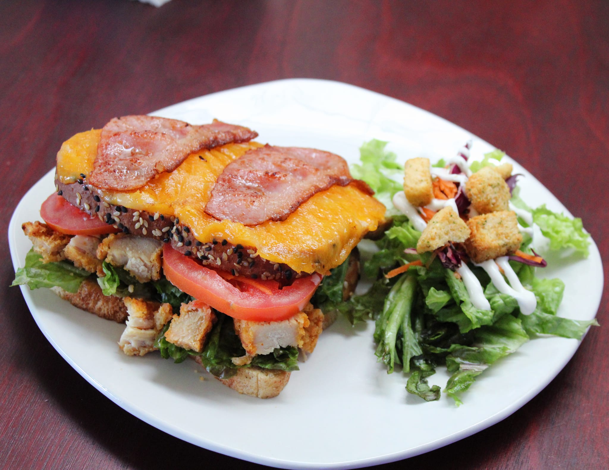 Emparedado de 7 granos, relleno de boneless de pollo, tocino, lechuga, jitomate, aderezo ranch, col morada y queso manchego.