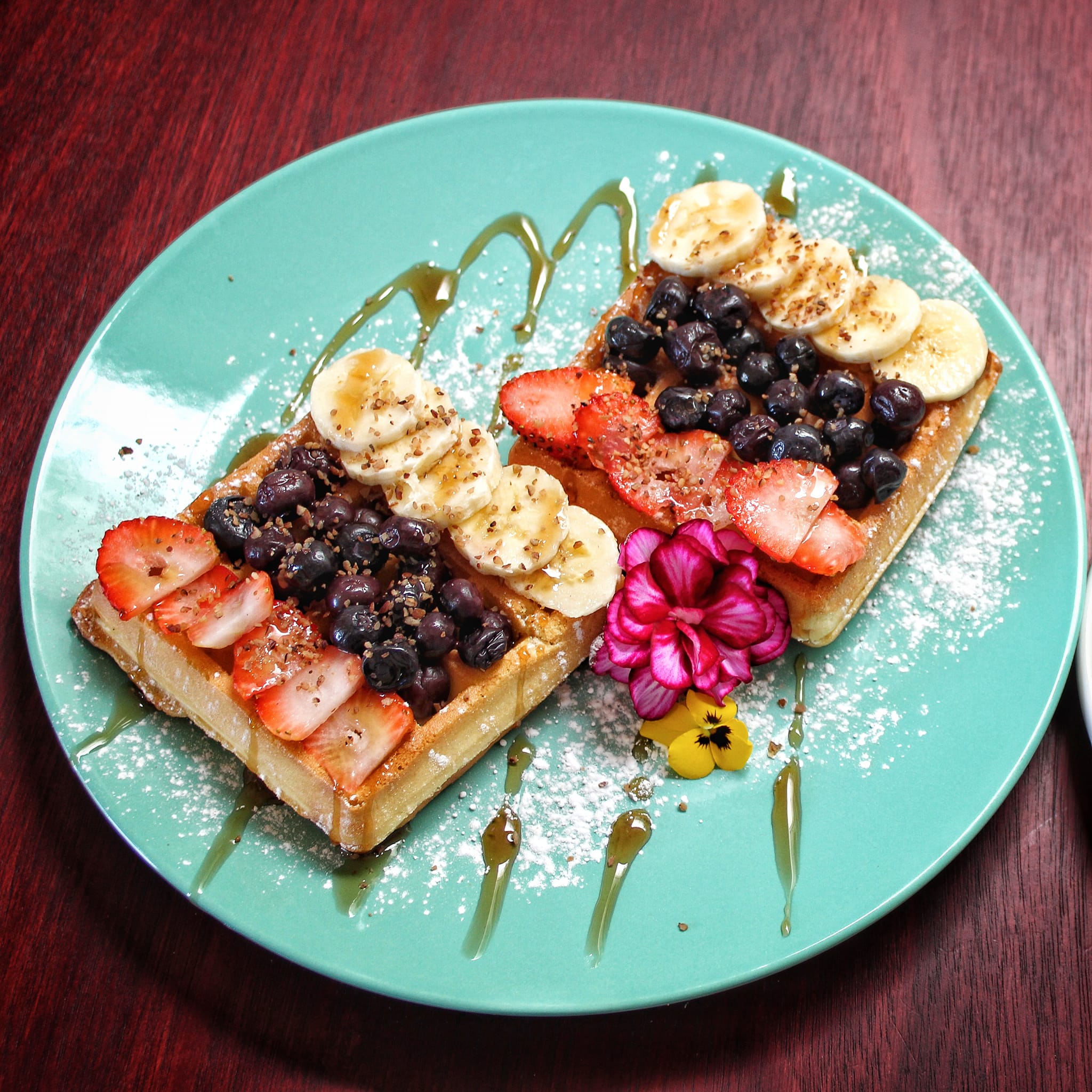 Dos waffles estilo belga, acompañados de moras,fresa, platano y nuez, bañados en jarabe de maple o de agave.