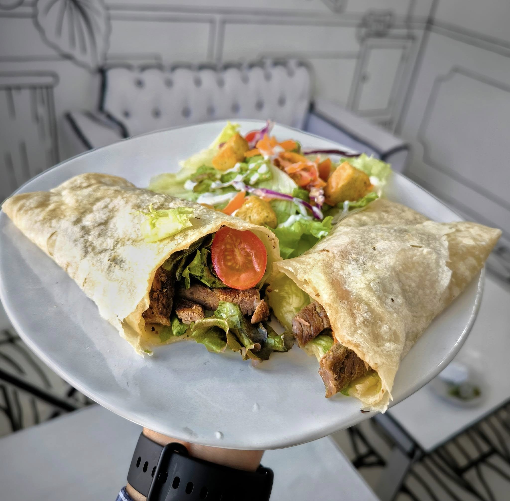 Burrito gigante elaborado con frijoles, guacamole,queso manchego, lechuga y jugosas tiras de arrachera.